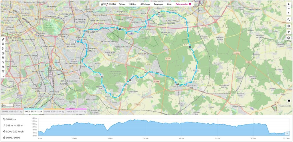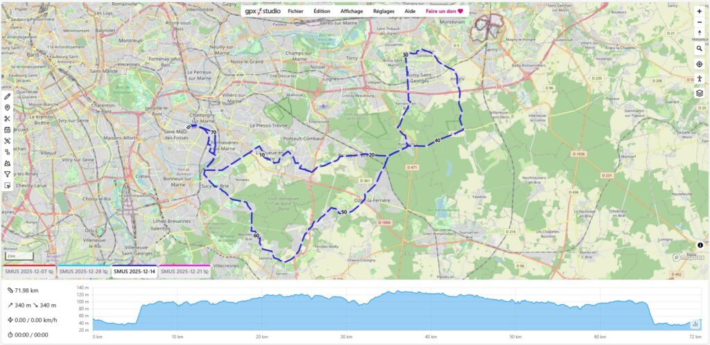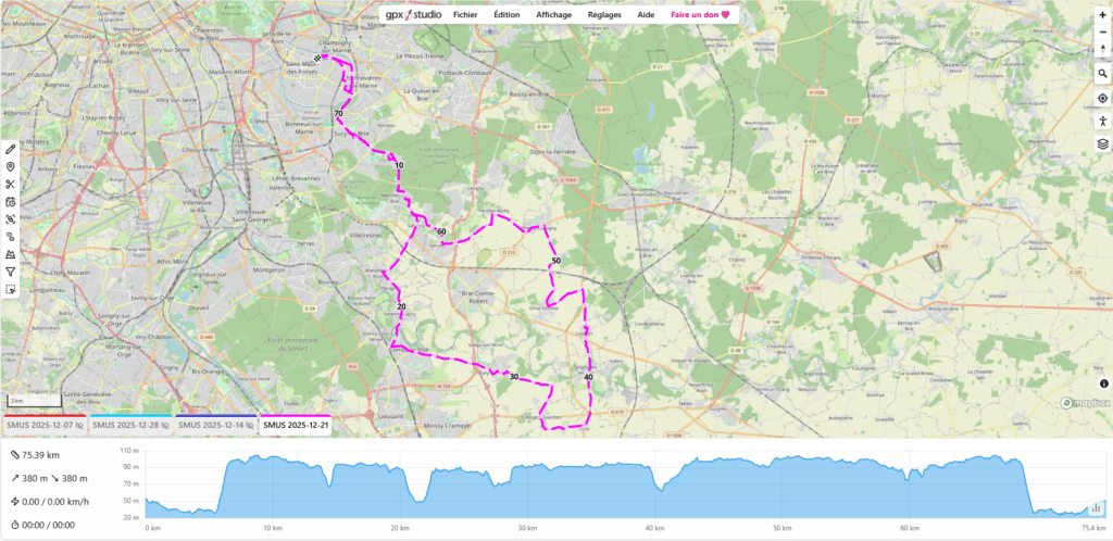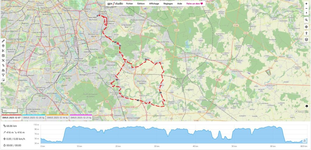 SMUS – Pont de Chennevières – Sucy (RER) – Boissy RER (9H00 Repos de la montagne) – Maréchal de Saxe – Yerres – Brunoy (la Pyramide) – La Faisanderie – Tigery – Lieusaint – Combs la Ville – Evry-Grégy – Brie Comte Robert – Chevry-Cossigny – Ozoir – Lésigny (Clos des vignes) – Santeny – Marolles – Sucy – Saint-Maur.